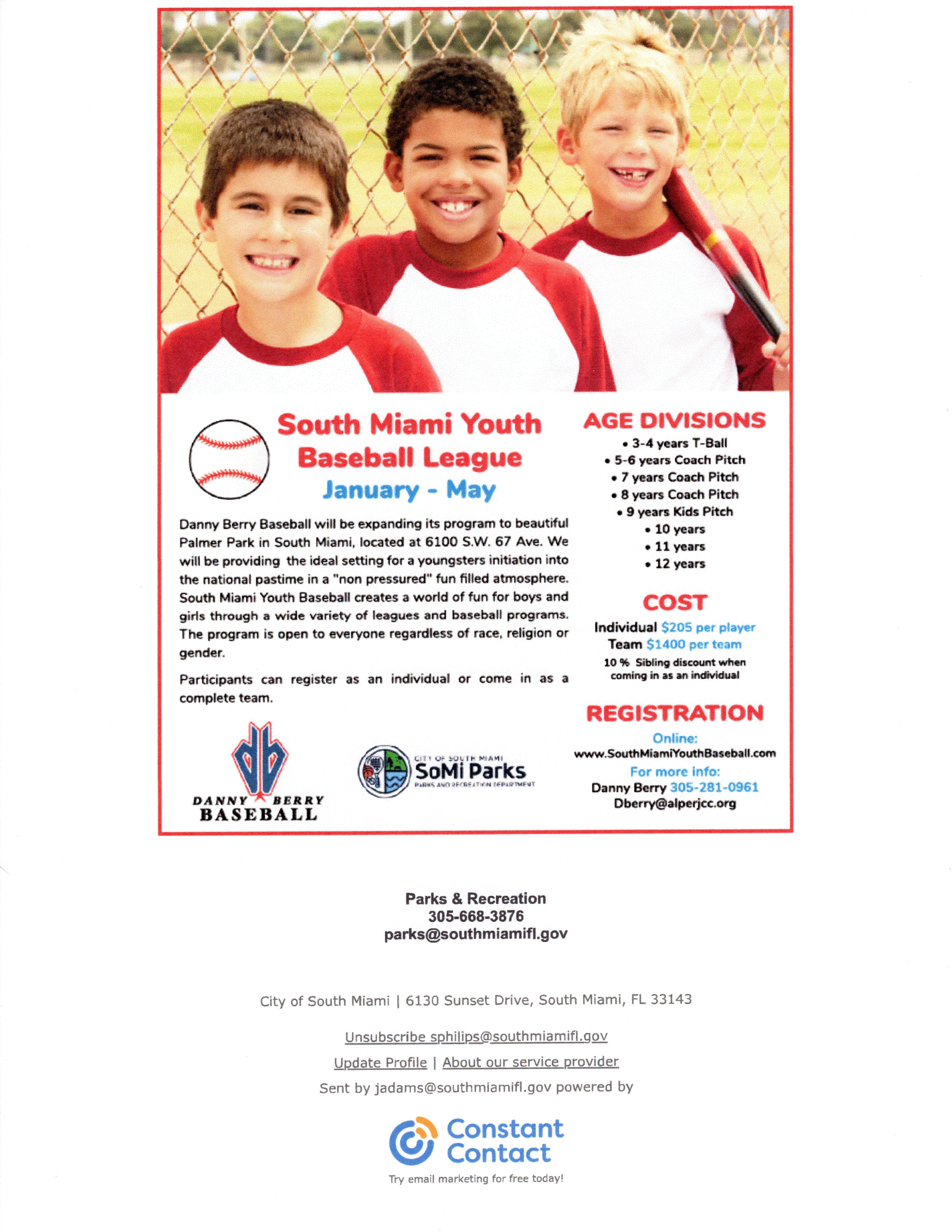 -> South Miami Youth Baseball League, ages 3 - 12, January through May. Click here for more details.